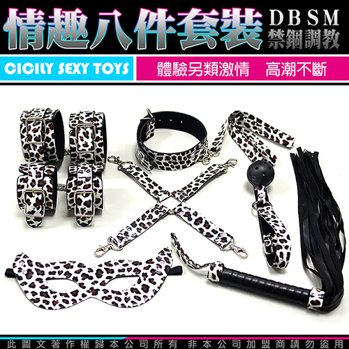 虐戀精品CICILY SM帝國 面罩/口塞/皮鞭/十字扣/手銬/乳夾/頸圈/腳銬 八件組 豹紋款